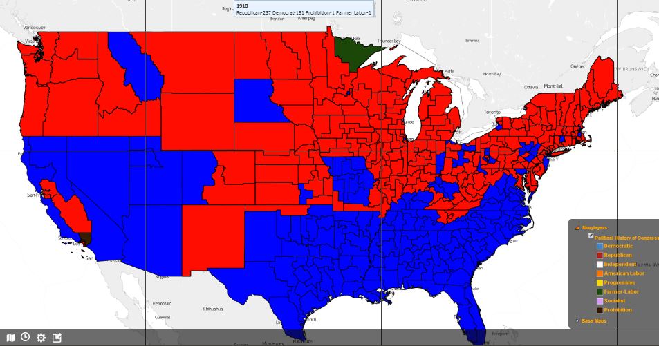 A research aide at Arizona State University’s Decision Theater, Jonathan Davis, compiled data on party control by Congressional district from 1918 to 2012, color coded it all, and animated.