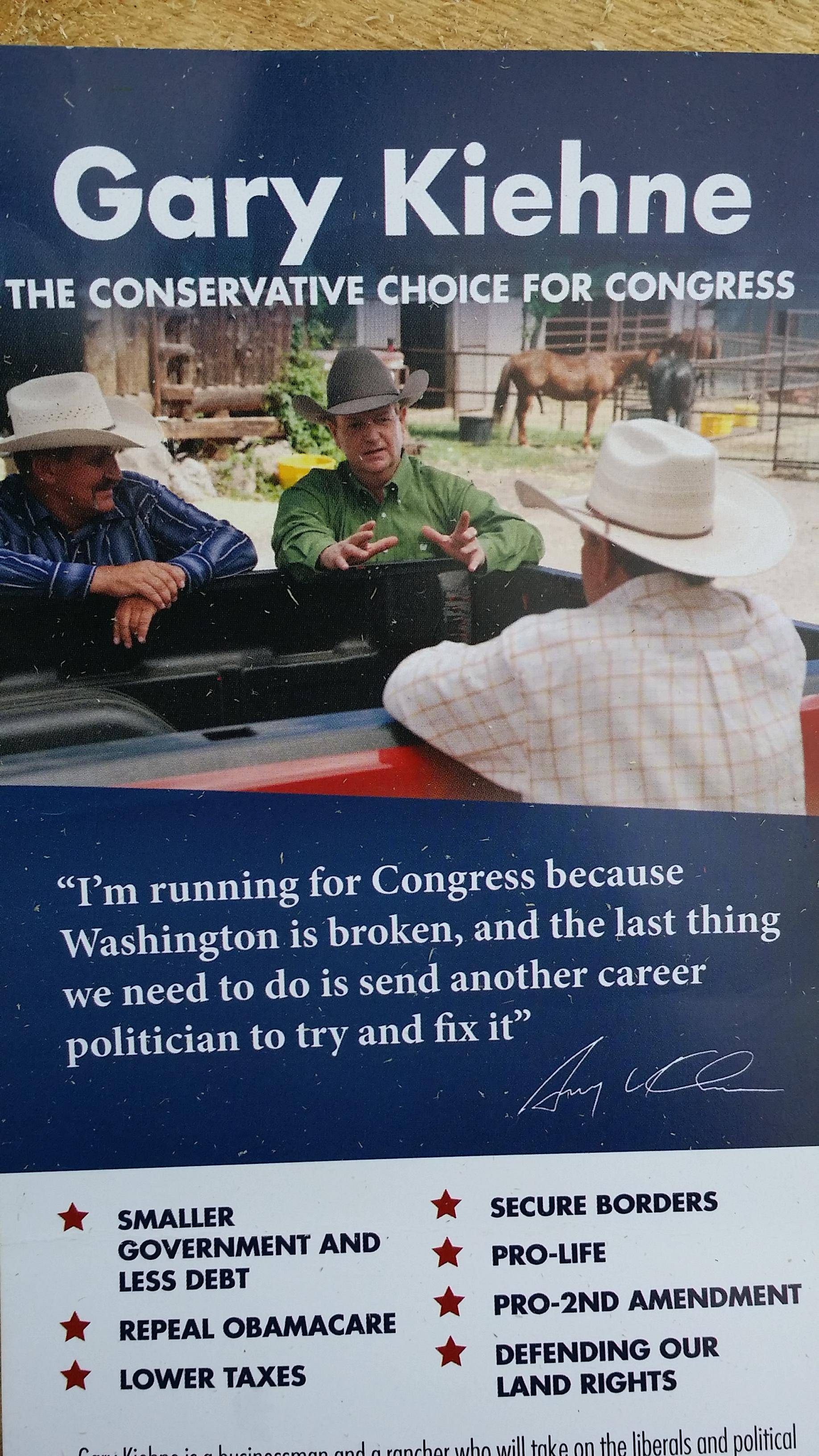 In his latest campaign flyer, Arizona congressional candidate Gary Kiehne – a horse rancher by trade – is shown on his farm, talking with two other men. The text below hits all the Republican marks: smaller government, lower taxes, repeal Obamacare. No surprises there.