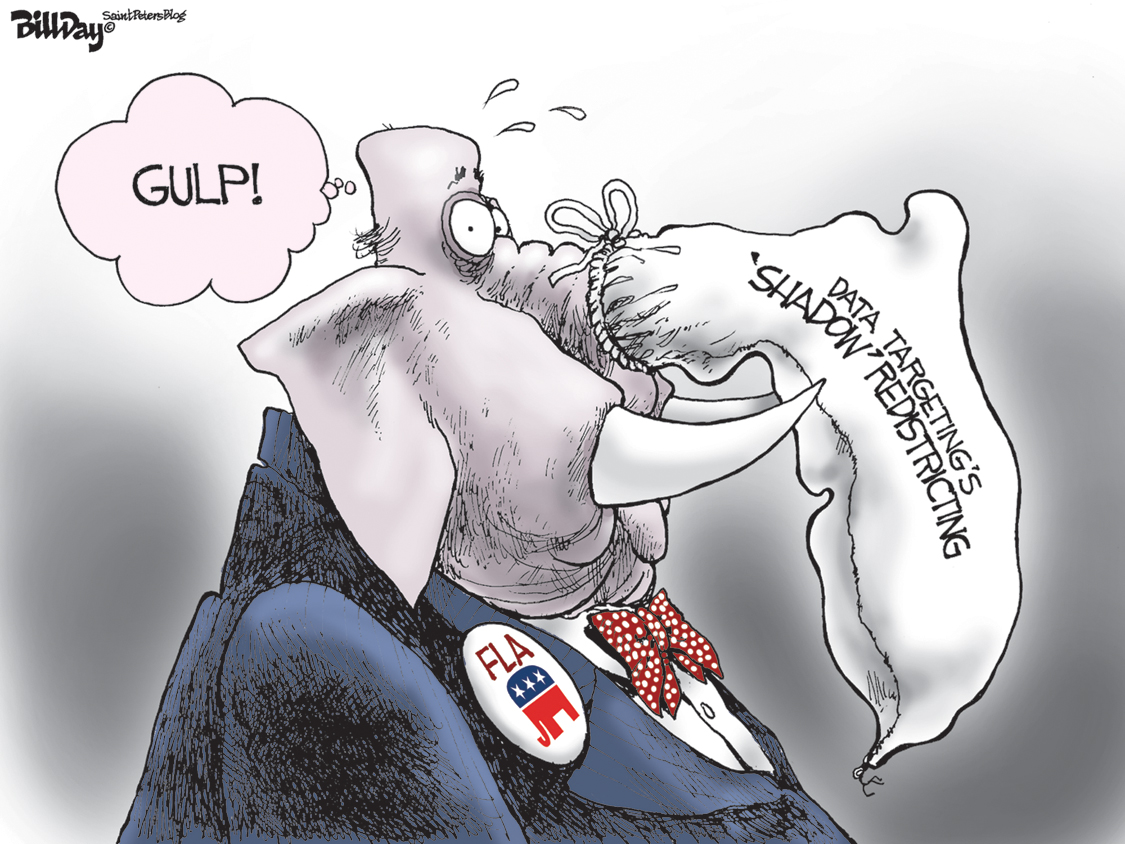 Bill Day’s newest editorial cartoon weighs in on the trial over whether Florida legislators broke the law by using a “shadow” process during the 2012 redrawing of new Congressional maps that were held behind closed doors.