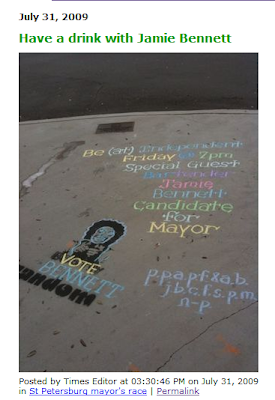 The problem with this invitation is the disclaimer. Because this was an invitation to a fundraising event, it needs the extended disclaimer as required in Sections 106.025 and 106.143, F.S., i.e., “The purchase of a ticket for, or a contribution to, the campaign fundraiser is a contribution to the campaign of…” Obviously, Bennett’s invitation does not have the required language. So he’s looking at another complaint with the Florida Elections Commission. You’d think, after all Bennett’s been through, including having to file three amended campaign finance reports, that he would at least know how to dot the i’s and cross the t’s.