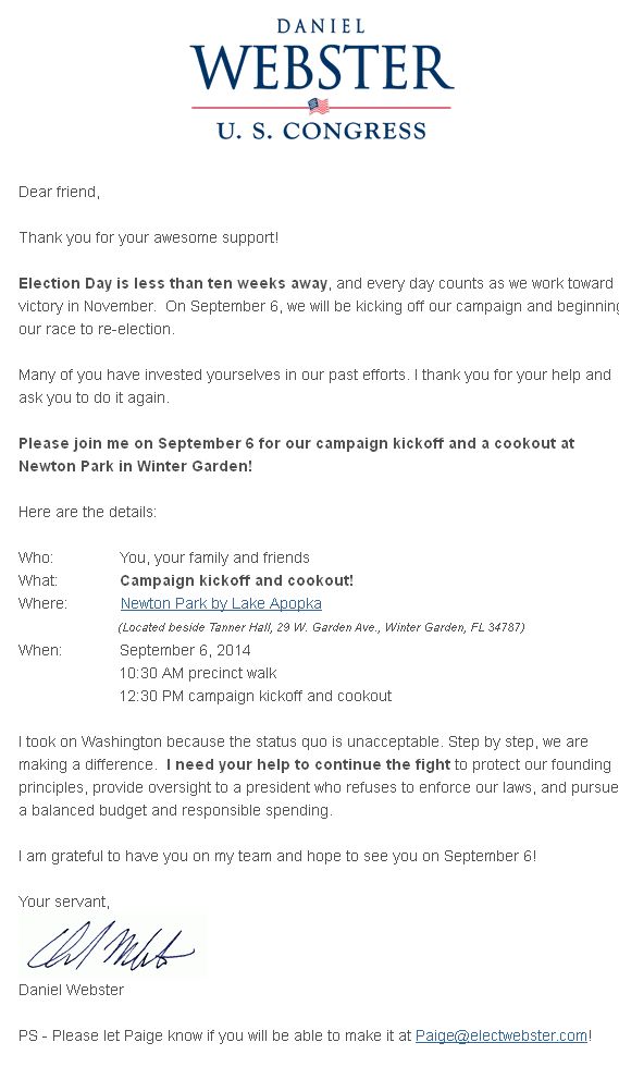 The invitation goes on to touch upon Webster’s GOP priorities, including a dig at Barack Obama, who “refuses to enforce our laws” as well as a call for “balanced budget and responsible spending.”