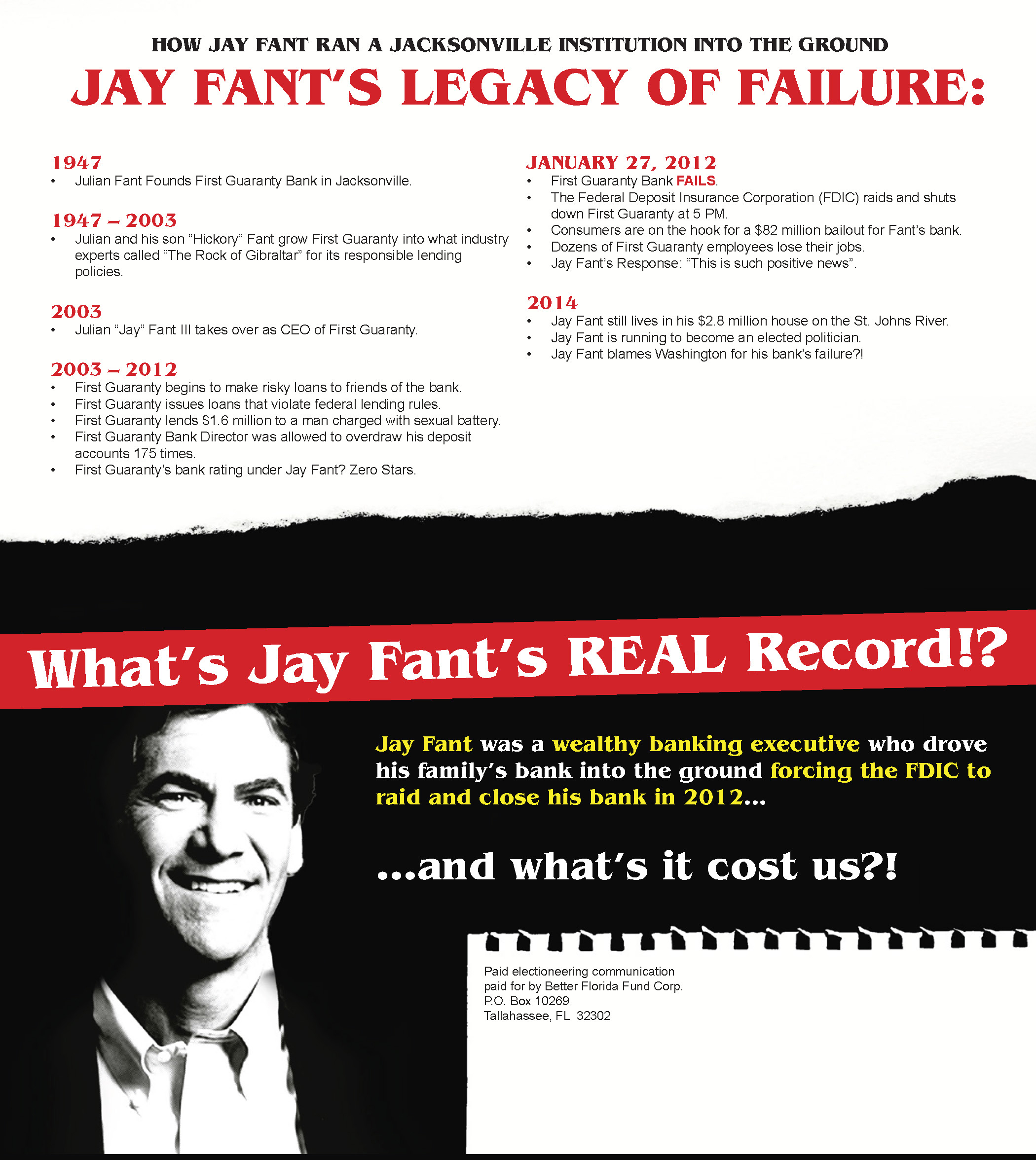 Misconduct caused the failure of Republican candidate Jay Fant’s family business, First Guaranty Bank & Trust in Jacksonville, during his nine years as CEO, according to a new mailer hitting mailboxes Monday in House District 15.