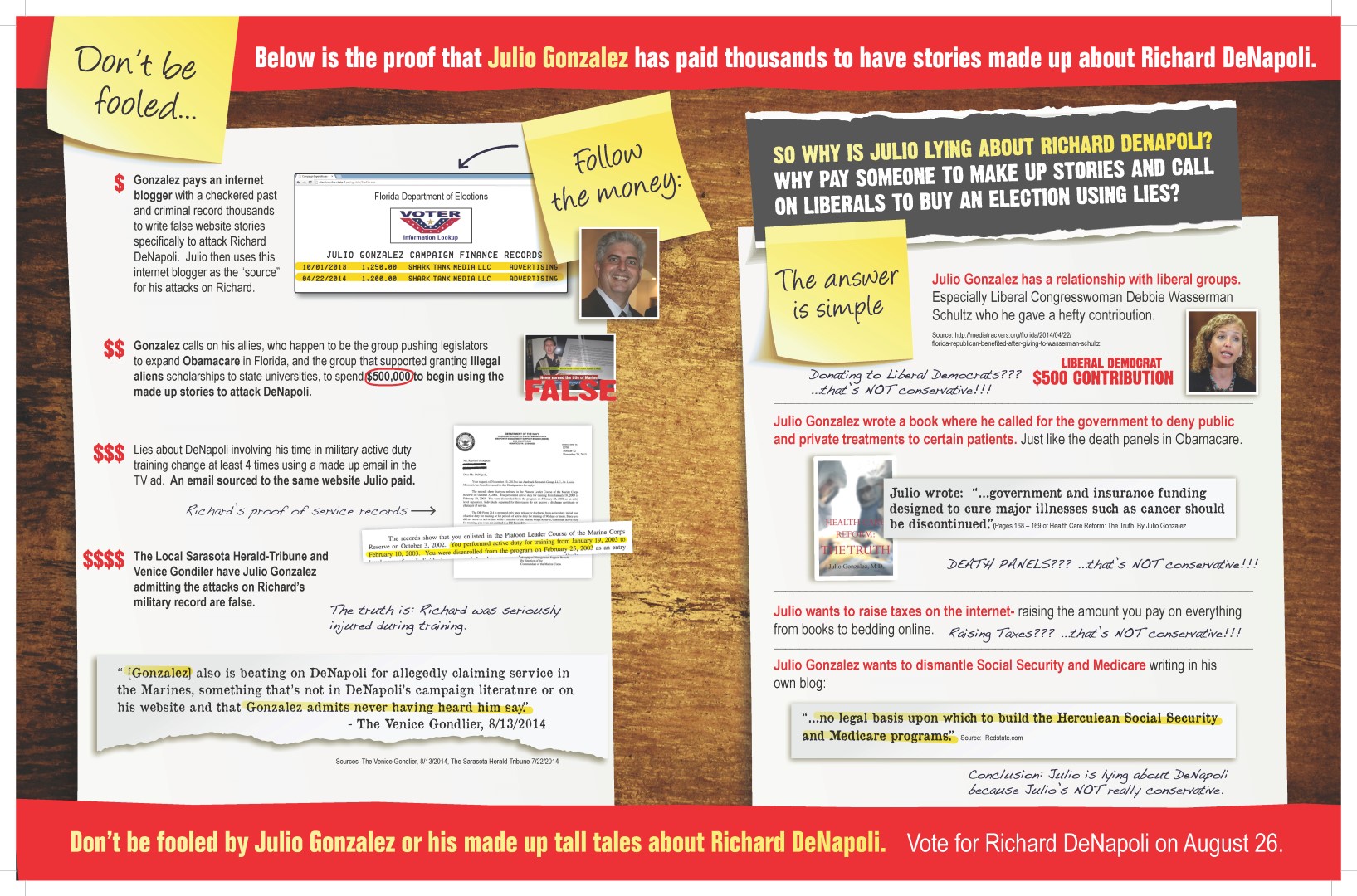 A new direct mail piece from House District 74 GOP hopeful Richard DeNapoli gives “proof” of the lies he says are being spread by his primary opponent, Venice Republican Julio Gonzalez.