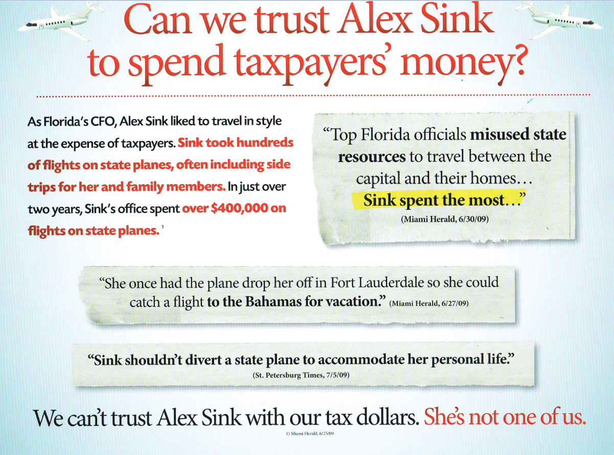 The ad obscures the fact an ethics committee cleared Sink of any state law violations, and aircraft diversions were commonplace for high-ranking officials at the time.