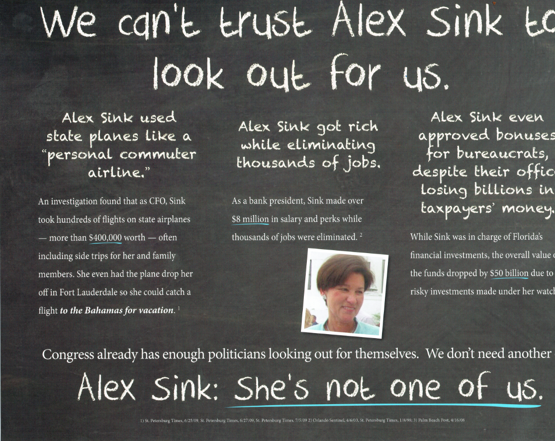 It’s a mailer from the Republican Party of Florida (starring one atrociously fake-looking hand) hitting the familiar notes about Sink using a state plane for personal reasons, as well as some ridiculous charges about Sink getting rich while eliminating jobs while at Bank of America.