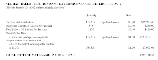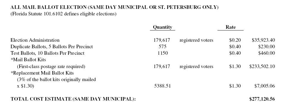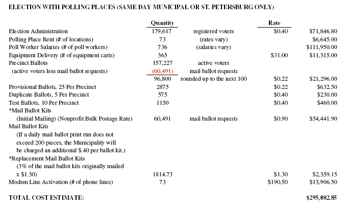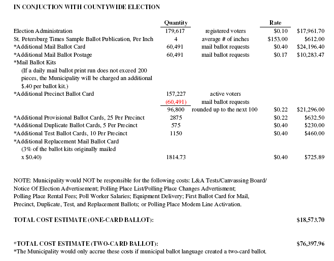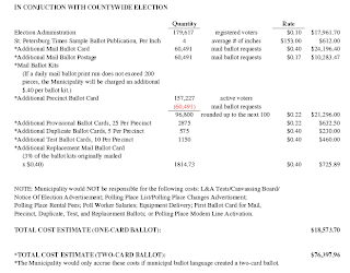 For elections beginning in 2010, each municipality (elected officials, managers, city clerks) was provided their cost estimates for conducting elections (in conjunction with the county, with other municipalities, as a stand-alone election, and as an all mail ballot election).