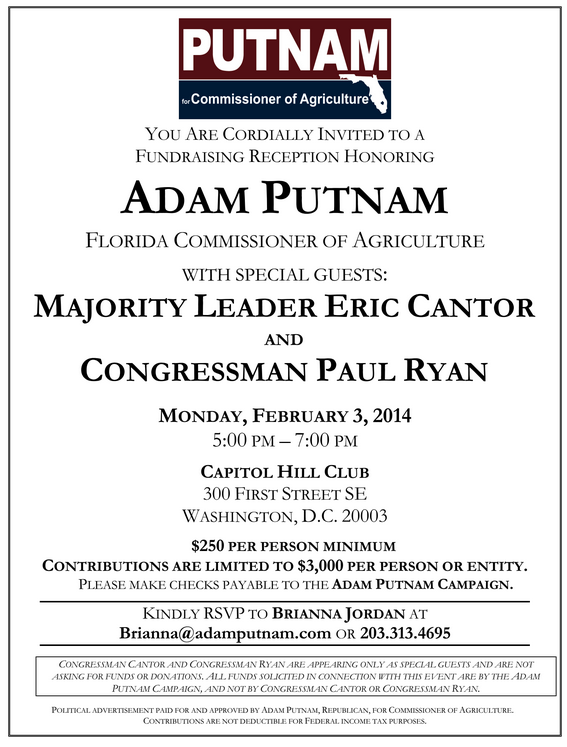 It certainly says something about Putnam that he maintains strong enough ties with Cantor and Ryan that they are willing to host a fundraising reception for him. Putnam served in Congress representing Florida’s 12th Congressional District from 2001-11.