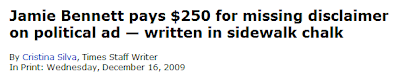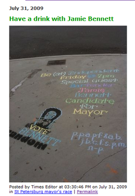 Just yesterday, the St. Petersburg Times published a story written by Cristina Silva titled: “Jamie Bennett pays $250 for missing disclaimer on political ad — written in sidewalk chalk”