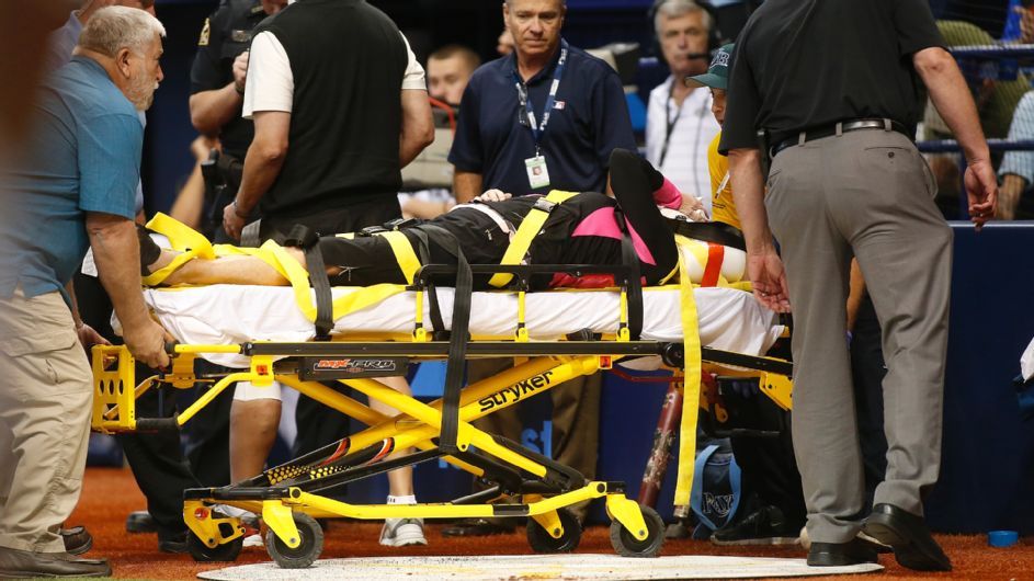 The game was delayed about 12 minutes so the injured fan could be removed on the stretcher that was brought out near the on-deck circle.