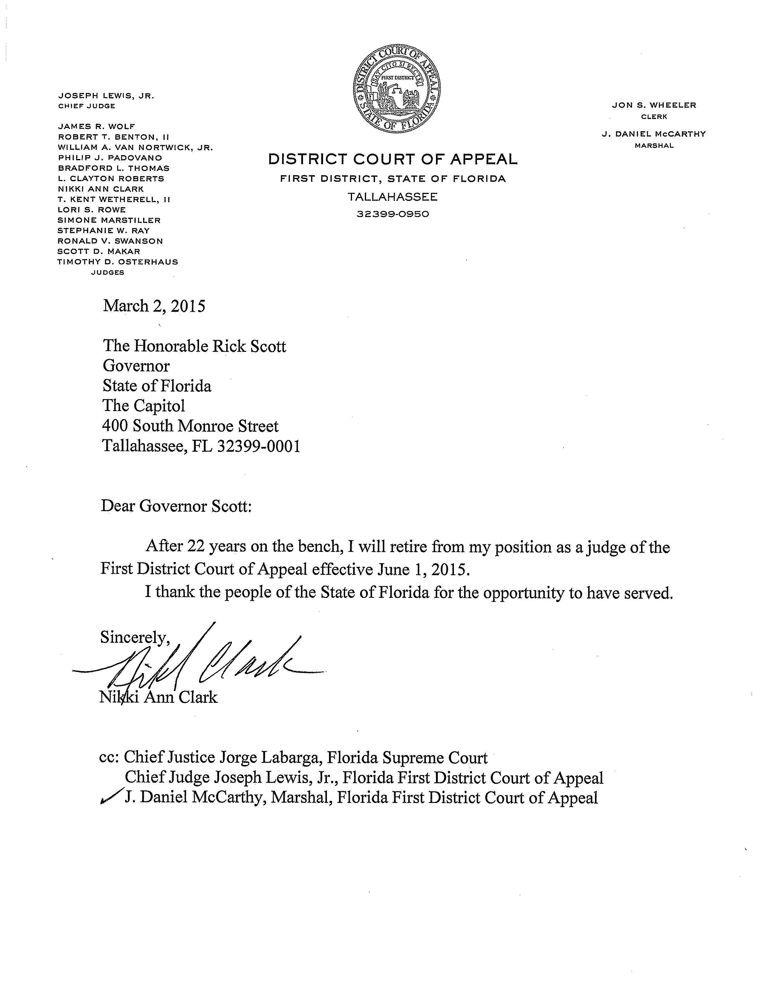 First District Court of Appeal Judge Nikki Ann Clark is retiring effective June 1.