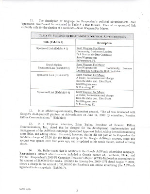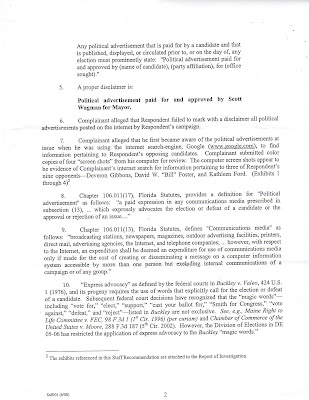 In a six-page decision (lengthy by FEC standards), the staff of the Florida Election Commission details how Wagman engaged a local design firm to promote his candidacy through advertising on a range of websites and social networks. The question for Wagman’s campaign was how to disclaim the ads when the sites’ design capacity limited the candidate’s spacial options. Florida election law, apparently written before the full utilization of online advertising, does not address how to properly disclaim a candidate’s message online. As Wagman asserted: “Because Florida wasn’t specific about disclaimers appearing on hypertext lins, we looked to Federal regulations that specifically don’t require disclaimers on hypertext link.”