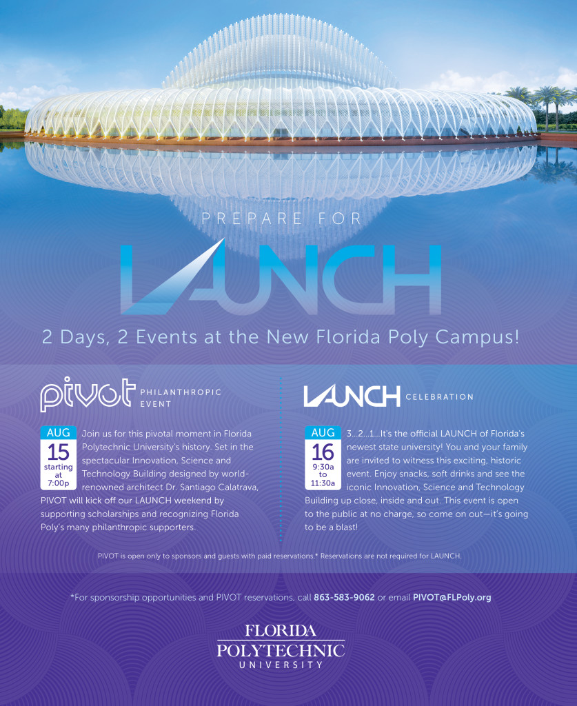 The two-day celebration begins at 7 p.m. on Friday with an exclusive PIVOT gala, open to sponsors and guests, as a “sneak preview” of the new facility illuminated during the evening. Reservations are $360 per person, and are available online at the Florida Poly website.