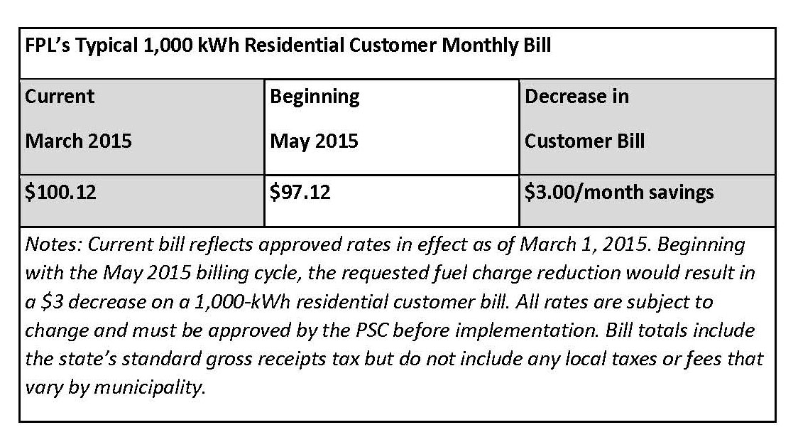 Florida Power & Light Company (FPL) today filed updated fuel cost projections for 2015 with the Florida Public Service Commission (PSC), requesting to reduce customer rates beginning May 1, thanks primarily to projected savings on natural gas costs.