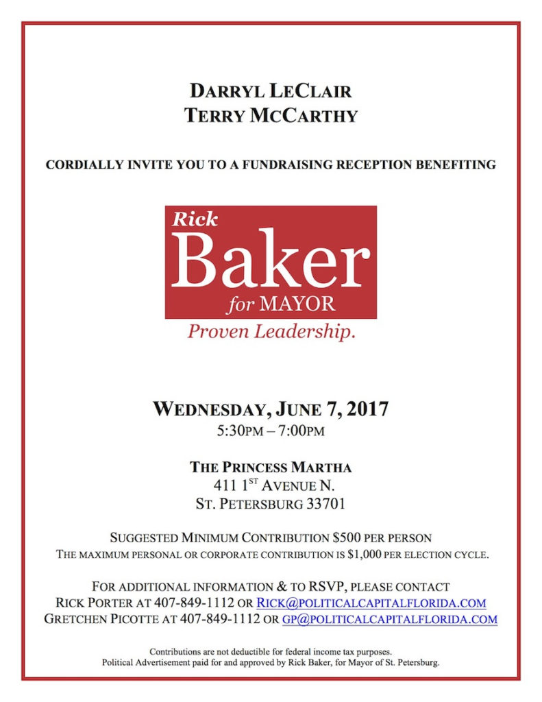 The former mayor has set a fundraiser for Wednesday in downtown St. Petersburg, this one being hosted by local political heavyweights Darryl LeClair and Terry McCarthy.
