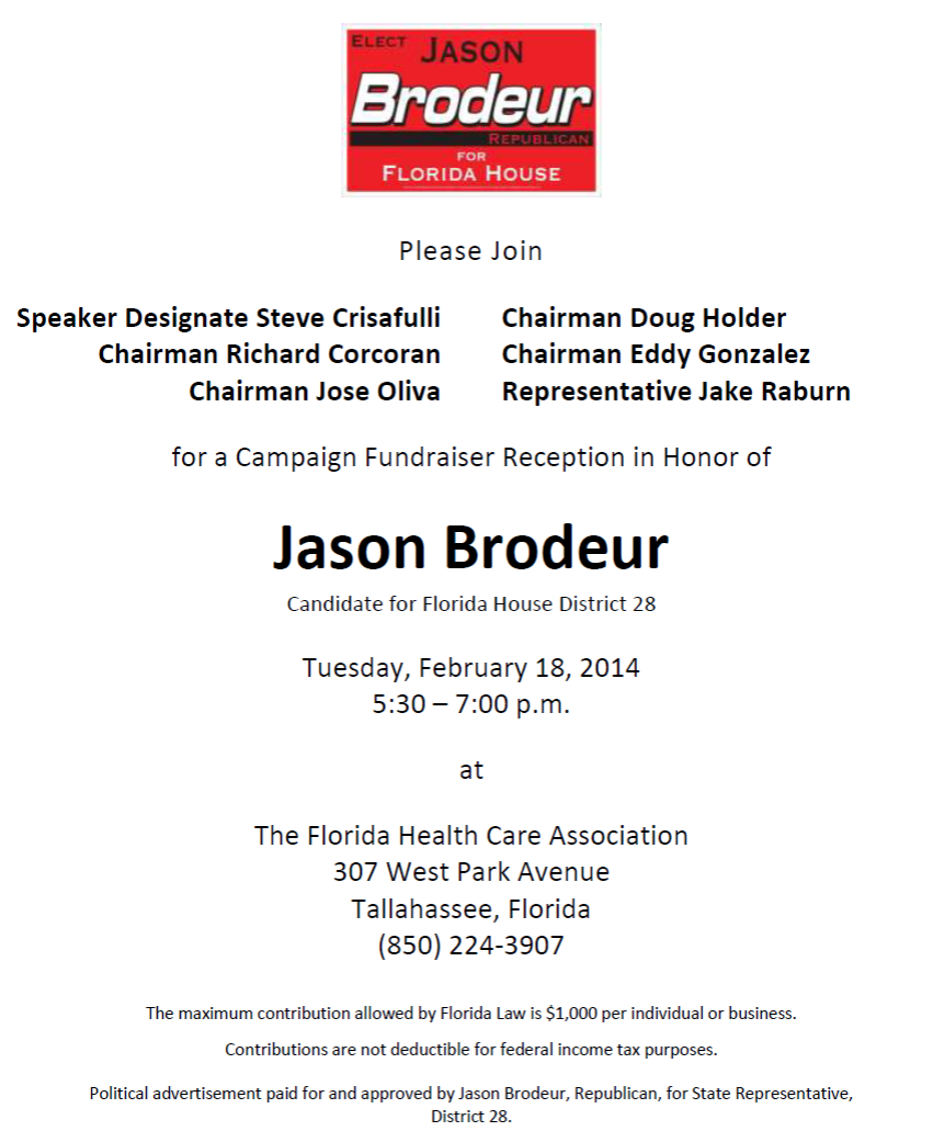 Later that afternoon, Crisafulli, Reps. Richard Corcoran, Jose Oliva, Doug Holder, Eddy Gonzalez, and Jake Raburn will host a reception for Rep. Jason Brodeur for his re-election to House District 28 covering east Seminole County. The fundraiser will begin 5:30 p.m. at the Florida Health Care Association, 307 West Park Avenue, Tallahassee. RSVPs are through (850) 224-3907.