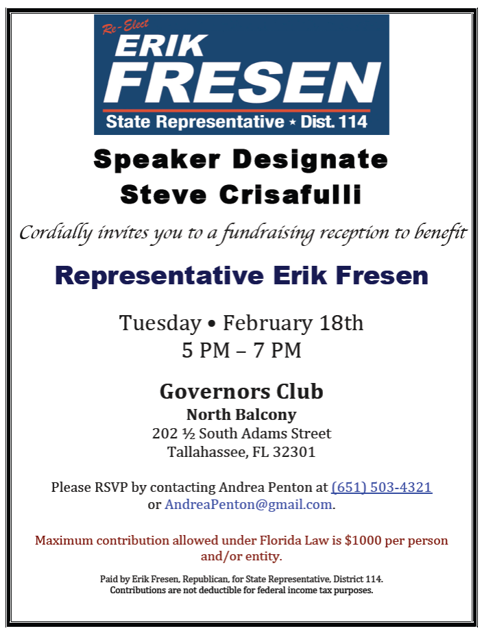 On Tuesday, Crisafulli is hosting a reception for Rep. Erik Fresen in his re-election effort for House District 114, which covers much of Miami-Dade County. The event begins at 5 p.m. at the Governor’s Club – North Balcony. RSVPs are through Amanda Penton at (651) 503-4321 or at [email protected].