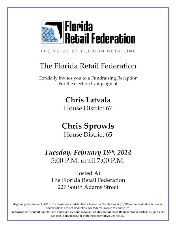 The Florida Retail Federation will be holding a joint fundraiser for GOP hopefuls Chris Latvala for House District 67 and Chris Sprowls for House District 65. The event will be at 5 p.m. at the FRF offices at 227 South Adams Street.
