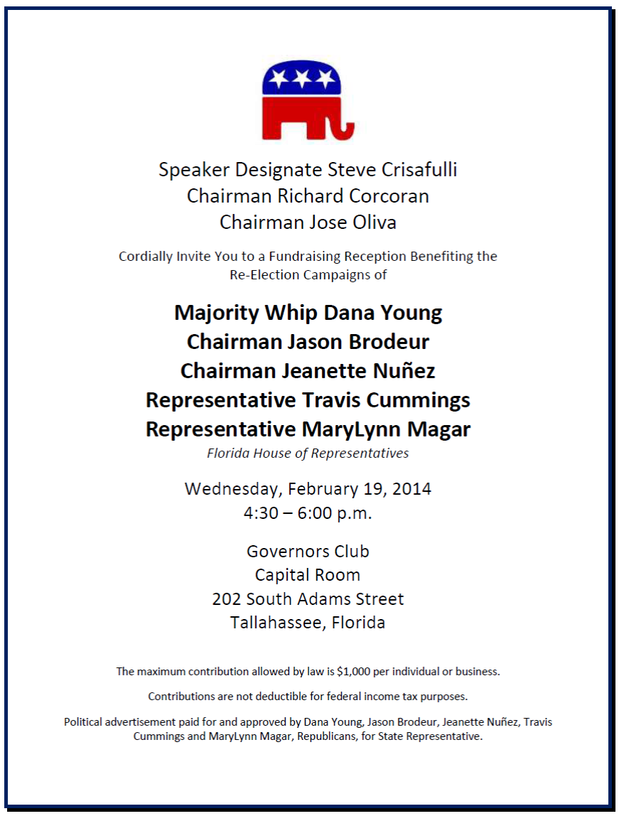 Expect a good turnout Wednesday afternoon in the Capital Room of the Governor’s Club since much of the state GOP leadership will be there for a fundraiser benefiting Rep. Matt Caldwell. The event will include Senate President Don Gaetz, President Pro Temp Garrett Richter, House Speaker Will Weatherford, and Speaker Designate Crisafulli. Caldwell’s event begins at 4:30 p.m.
