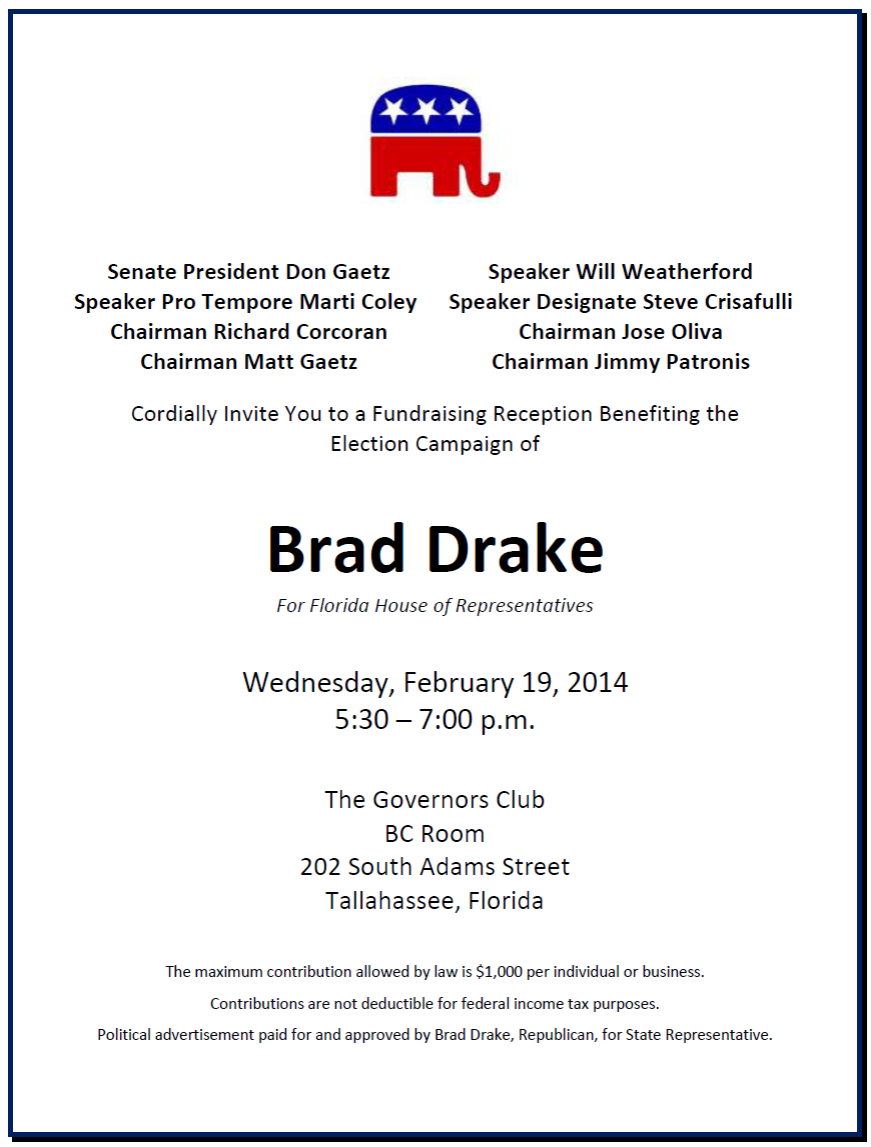 At 5:30, a reception honoring former Rep. Brad Drake will be at the BC Room of the Governor’s Club. Drake is seeking to return to represent House District 5, which covers Holmes, Jackson, Walton and Washington Counties and parts of Bay County.