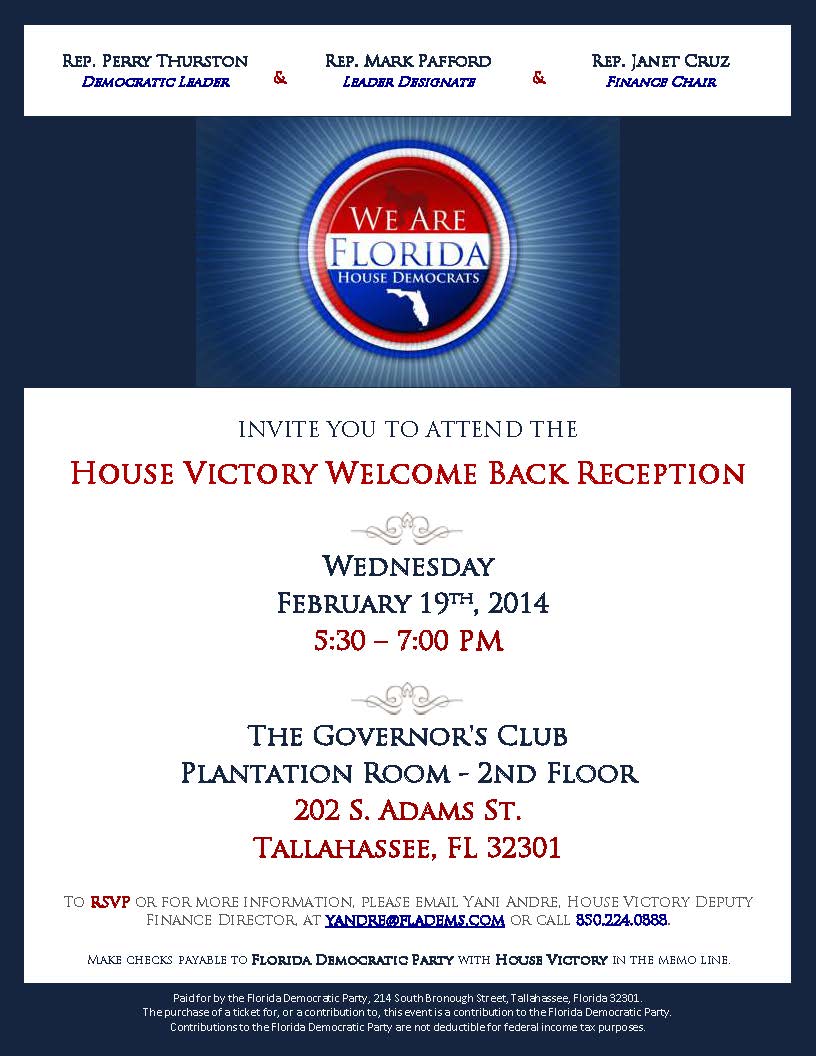 Thurston, Pafford and Rep. Janet Cruz will host the House Victory Welcome Back Reception beginning 5:30 p.m. at the Second Floor Plantation Room of the Governor’s Club. RSVP for that event also through Andre at [email protected] or (850) 224-0888.