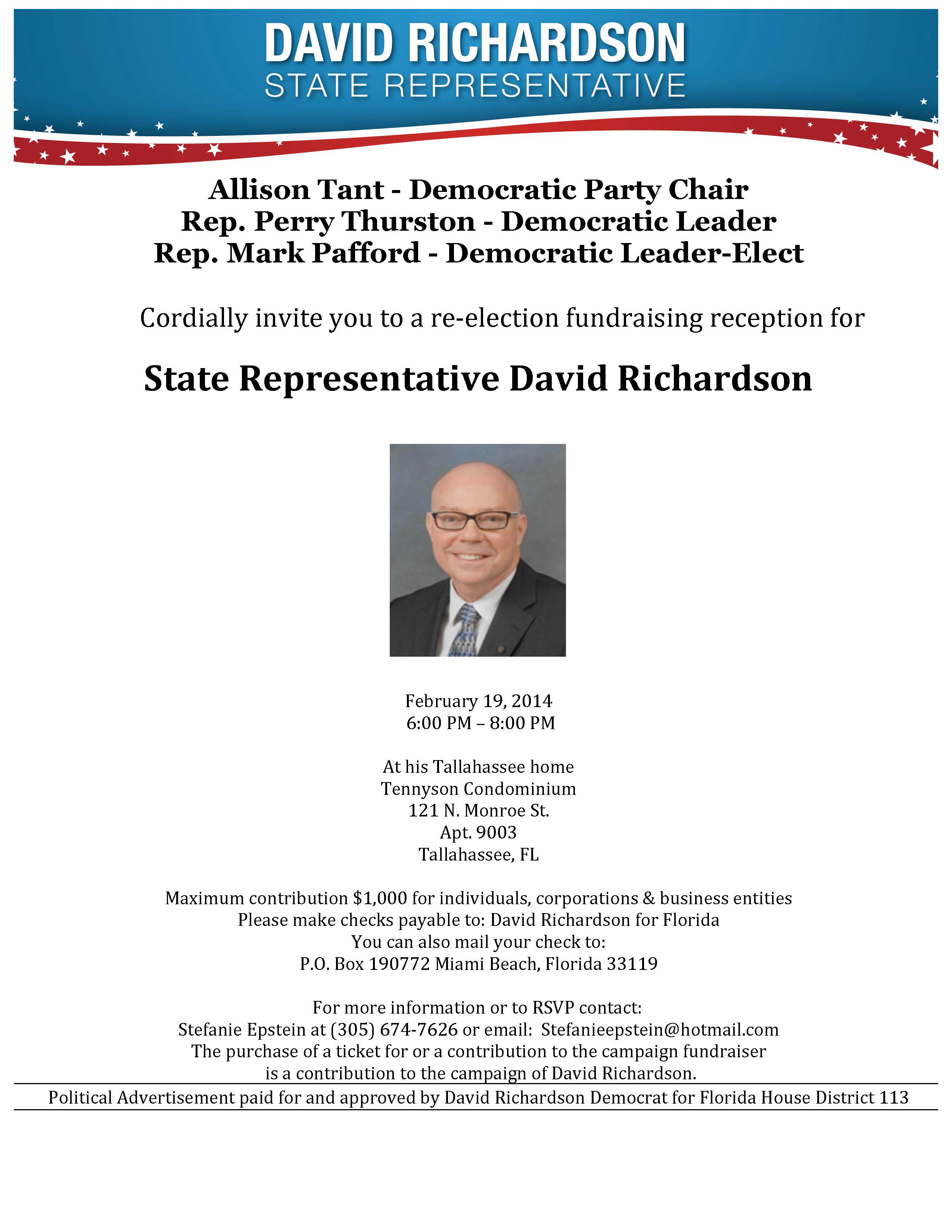 Tant, Thurston and Pafford are also hosting a House District 113 re-election fundraiser for Rep. David Richardson beginning 6 p.m. Wednesday at his Tallahassee condominium, 121 N. Monroe St., Apt. #9003. For information or RSVPs, call Stefanie Epstein at (305) 674-7626 or email [email protected].