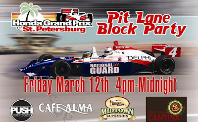 Celebrate Saint Petersburg’s Premier Event the Honda Grand Prix of St. Petersburg by joining us for the Kick-Off Event this March 12th from 4 pm on. This is a full-on Pit Lane Block Party encompassing all of the Mc Nulty Block. The Indy Car Race Experience will be on hand offering rides on our own downtown streets. Proceeds from the rides go to St. Pete’s own homegrown charity Children’s Dream Fund. Live music, entertainment, food, drink and fun supplied by Midtown Sundries, Café Alma, Push Ultra Lounge and Red Mesa Cantina. This is a free event open to the public. Any questions or concerns call 727-510-1921.