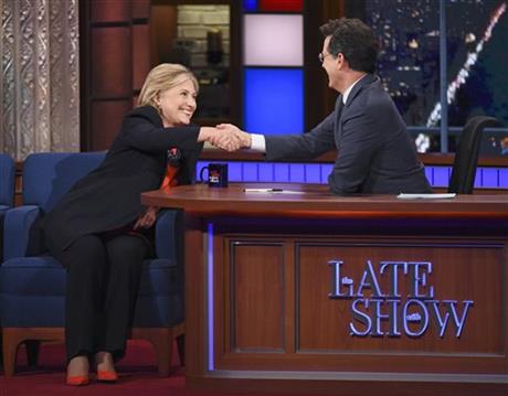 Clinton, the Democratic front-runner in the 2016 race, became the fifth White House hopeful from both parties to appear with Colbert since he took over CBS’ “Late Show” last month.