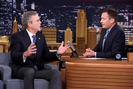 He was featured Tuesday night on the show’s recurring “slow jam the news” skit with host Jimmy Fallon. The job required Bush to recite lines about his candidacy while Fallon, stylized as a 1970s soul man and backed by the Roots, offered a series of double entendres. Bush took the straight man role that was most often filled by NBC’s suspended anchorman, Brian Williams.