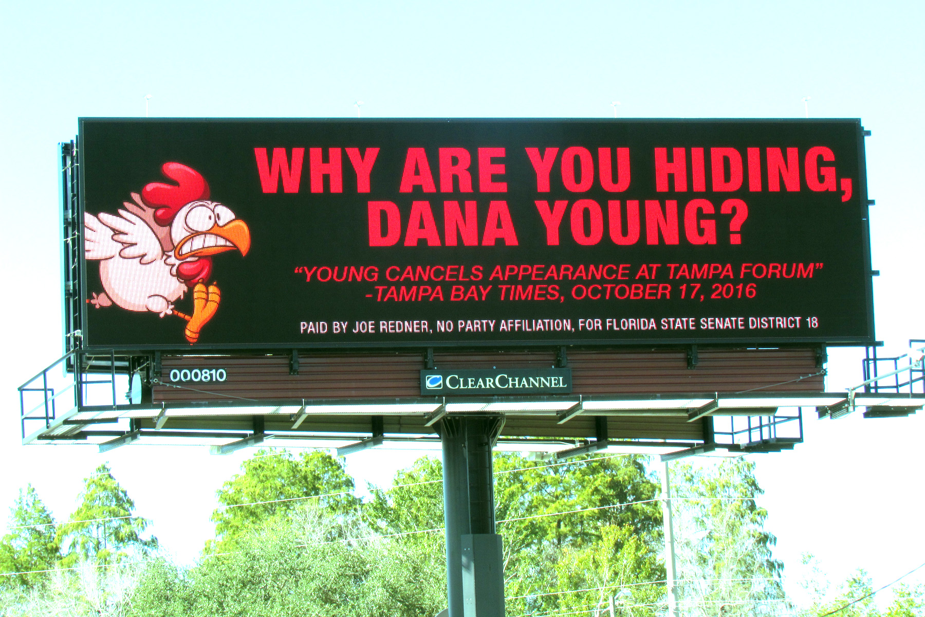 That prompted one of her opponents in the contest — independent Joe Redner — to pay to place a billboard ad asking “Why Are You Hiding, Dana Young?”