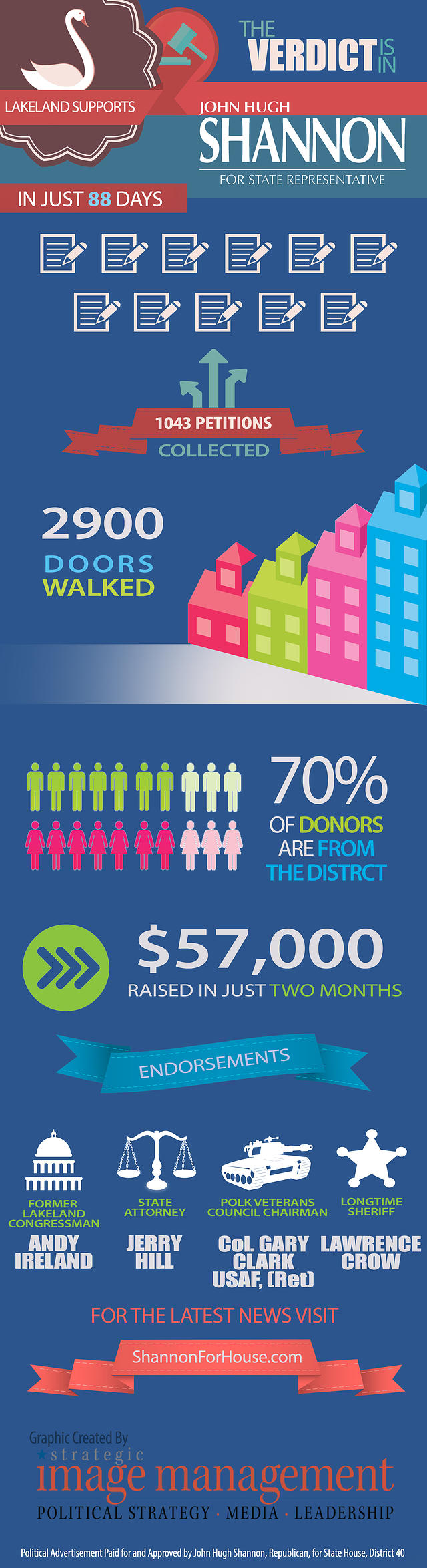 “A Thousand Words” is an infographic released by Shannon’s campaign on Tuesday, which shows the Republican qualified by petition, with 1043 signatures submitted, collected by knocking on about 2,900 doors in the district covering much of Polk County. The required number of signatures is just over 900.