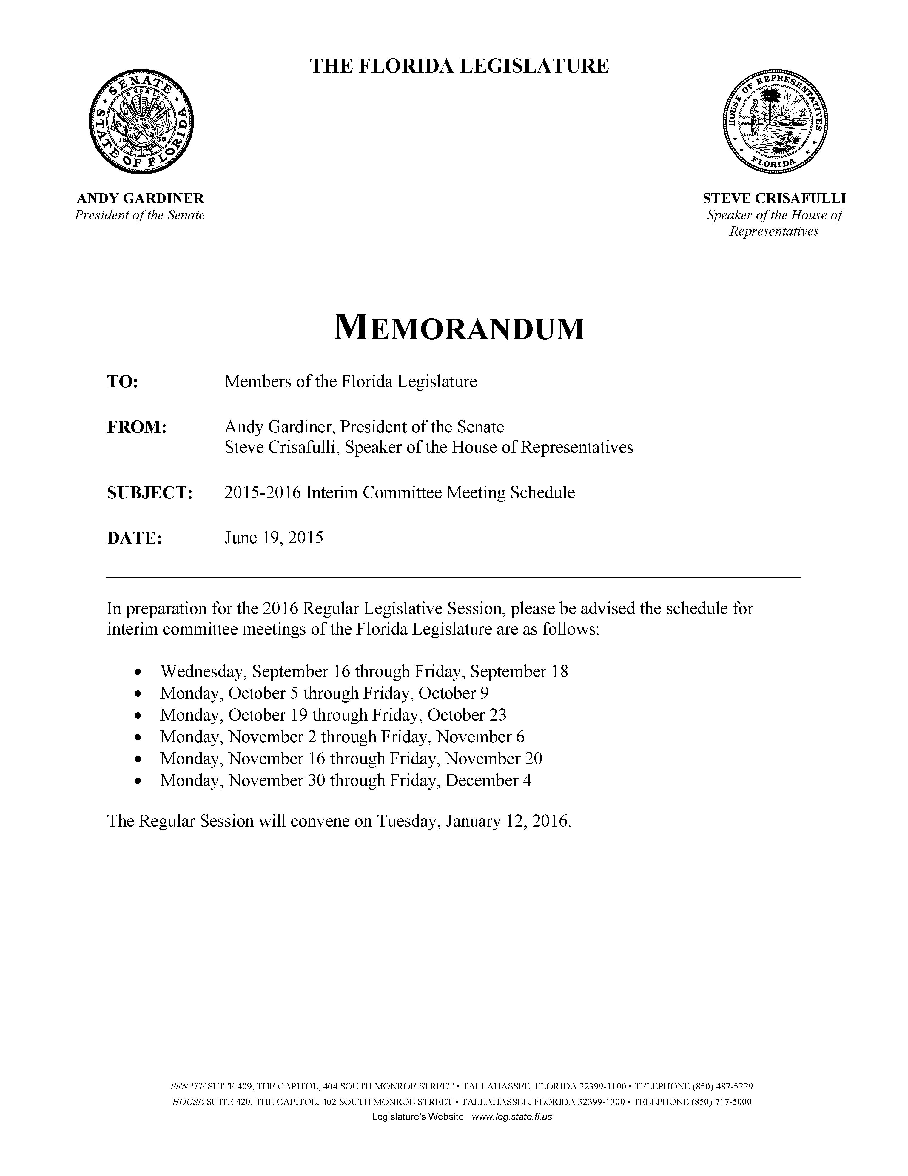 A joint memo released Friday from Senate President Andy Gardiner and House Speaker Steve Crisafulli announced preparations for the 2016 Regular Legislative Session, with a schedule of interim committee meetings.