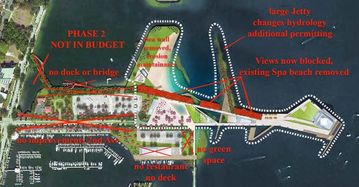 There’s also a broad aerial graphic showing an overview of the entire Pier from the uplands all the way to the Pier head. Lambdon slashes through several areas in red including part of the approach from Second Avenue, a dock or bridge connecting the approach to the mainland and, again, the restaurant space. In that same graphic he questions whether or not a large jetty would require additional permitting and alleges the existing Spa Beach is removed under the Pier Park Plan.