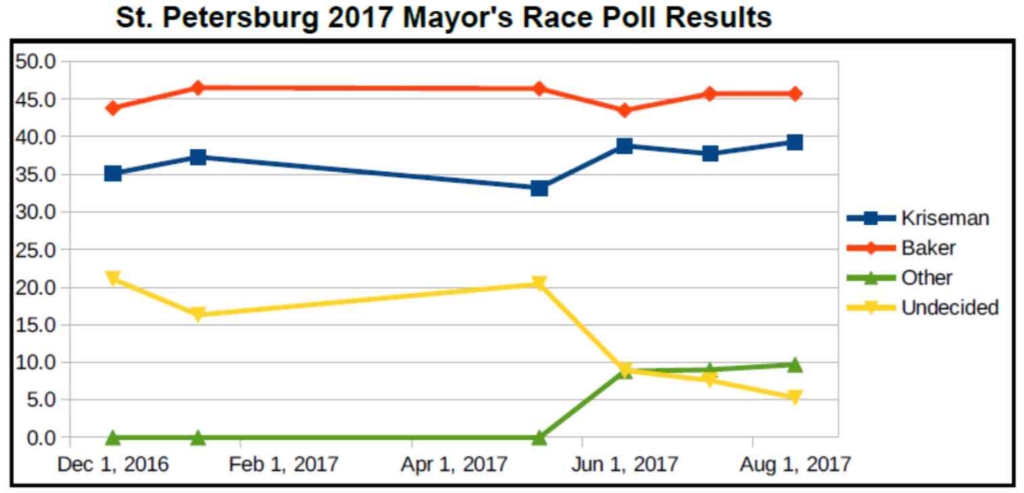 A survey taken on July 17 had Baker leading Kriseman, 46 to 38 percent.