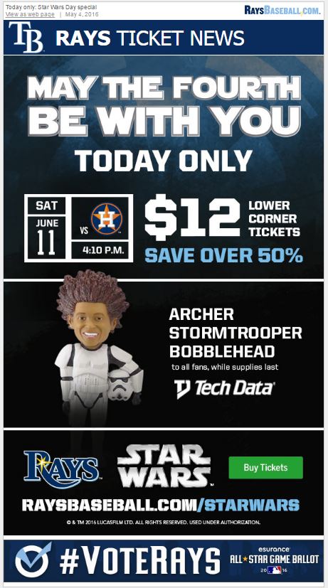 To honor May 4, the Rays are advertising one-day-only half-price ticket prices as well as a Star Wars-related giveaway.