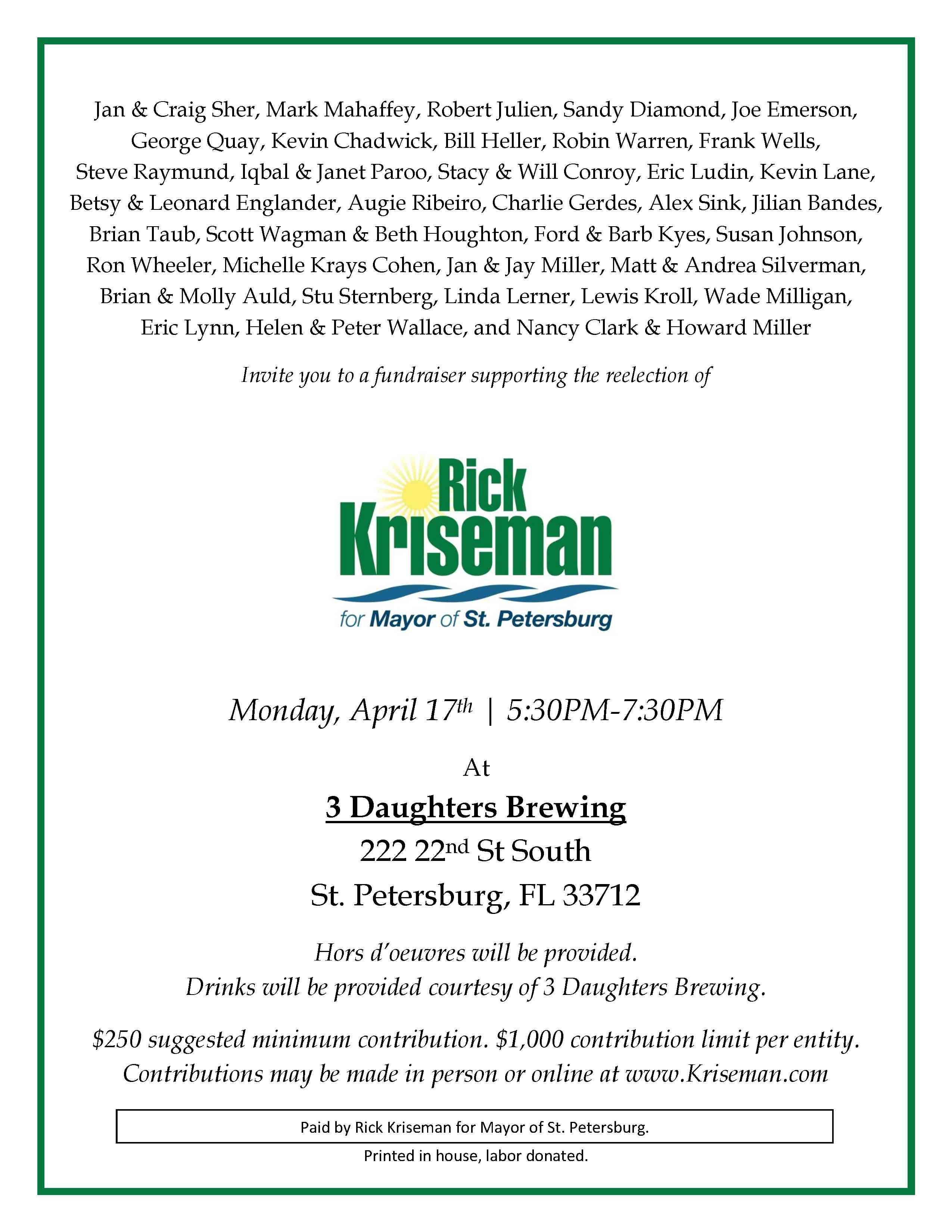The event is Monday, April 17, from 5:30 to 7:30 PM at 3 Daughters Brewing, 222 22nd St. S. in St. Petersburg. Suggested contribution is $250.