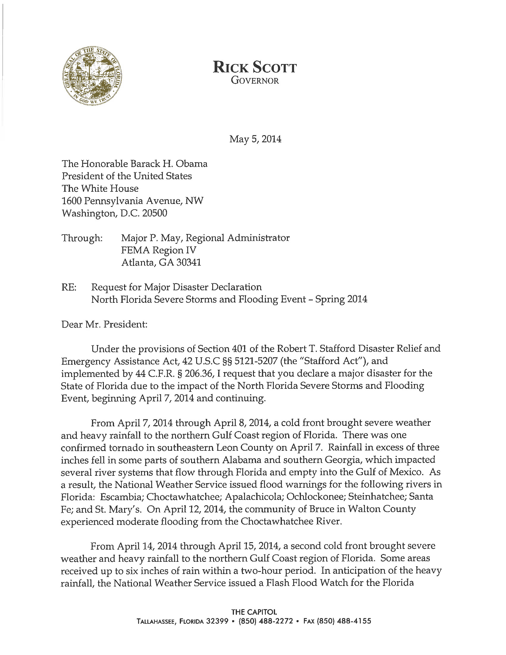 In Scott’s personal letter to President Barack Obama, and FEMA Atlanta Regional Administrator Major P. May, the governor outlined the severe weather affecting the Gulf Coast area: