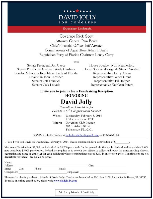 Governor Rick Scott, as well as the rest of the Florida GOP establishment, including CFO Jeff Atwater, Attorney General Pam Bondi, Ag. Commissioner Adam Putnam, and state chairman Lenny Curry, will host a fundraiser for congressional candidate David Jolly in Tallahassee.