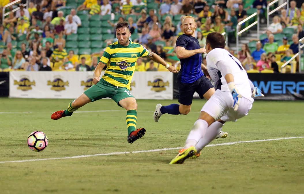 With the ball at his feet on the right sideline, Porter spotted Jacksonville goalkeeper Juan Fajardo off his line and took an audacious shot that Fajardo got a touch to, but couldn’t keep from going over the line for a 1-0 Rowdies lead in just the third minute.