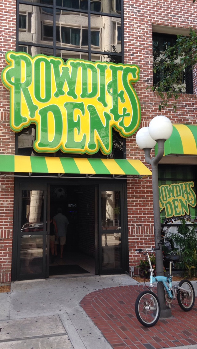 Pre-game, the place was slammed. It was basically standing-room only. Fans hooting like hooligans had fun in their Rowdies’ green and yellow. Everyone was getting a little liquored up — and why not? This guy Greg, who has been a life-time Rowdies fan, said they were asking too much for tickets up at the box office, so he hit up the Den for the match.