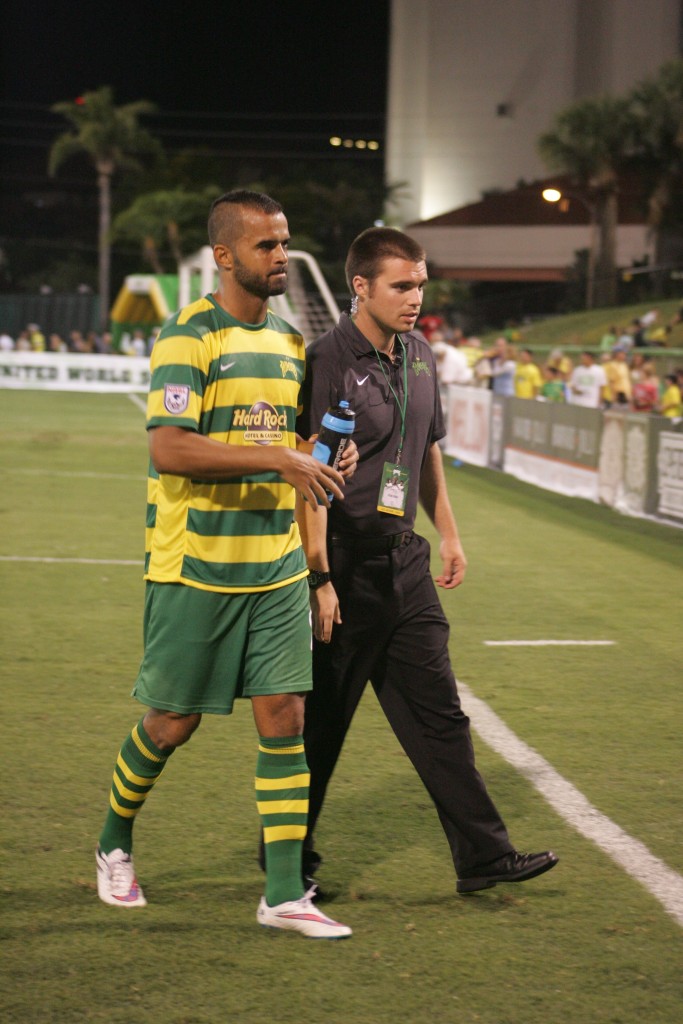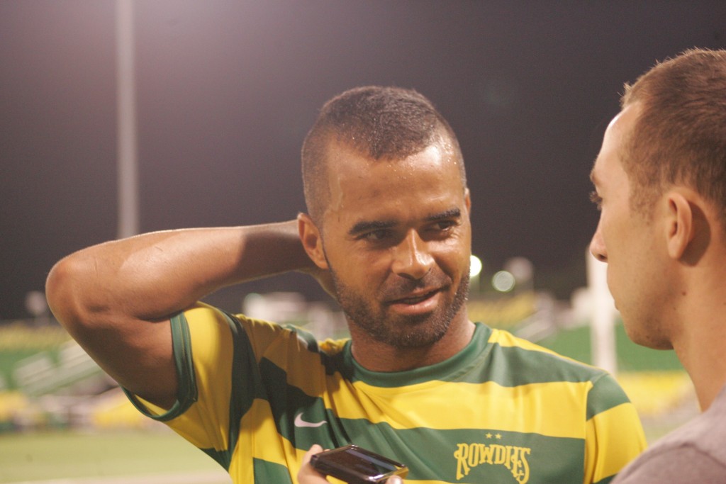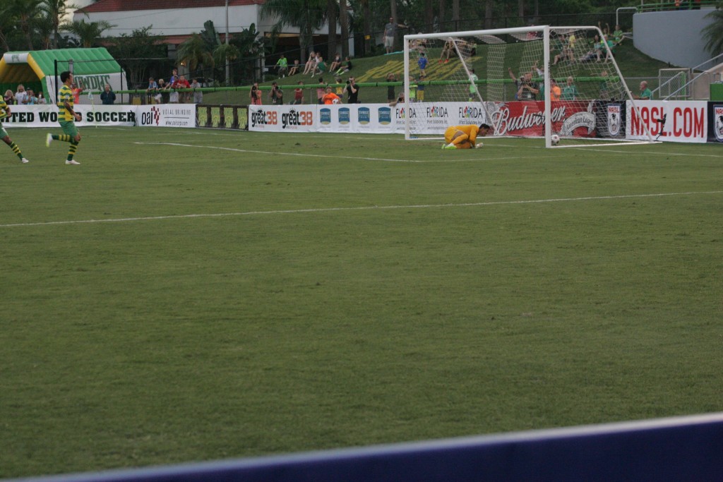 The scoring started off early, with a 12th minute penalty kick goal from Rowdies’ Brazilian forward, Maicon Santos, who plays big at 6’2” by using his body and strength to box out defenders who may have a step or two on him. Santos’ shot was straight, low, fast and to the right. It was his first goal of the season in only his second start for the Rowdies.
