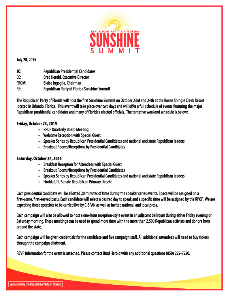 FieldingĀ fourĀ Florida-based candidates in the GOP primary and 29 valuable Electoral College votes, the Sunshine State is poised to be ground zero in the 2016 presidential race.Ā Leveraging its placeĀ in national politics, theĀ Republican Party of FloridaĀ is planningĀ the “Sunshine Summit” for October 23 and 24 in Orlando.