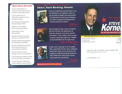 Why is it that we have three good candidates for City Council from one district and yet we are stuck with Leslie Curran and Wengay Newton from other districts? Anyway, Steve Kornell’s mail-piece to absentee ballot requesters arrived yesterday. Standard fare, but sharp enough. Considering his budget, I award it a solid ‘B’ grade.