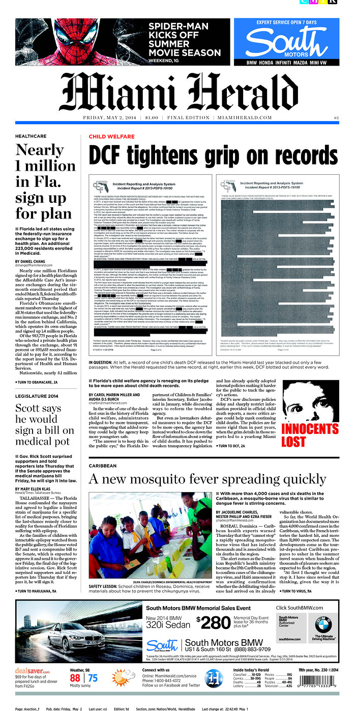 Mind you, the Herald frontpaged an important story about the Department of Children and Families, the coverage of which the Herald has been driving. Still, the Herald chose to give better real estate to its story about medical marijuana.