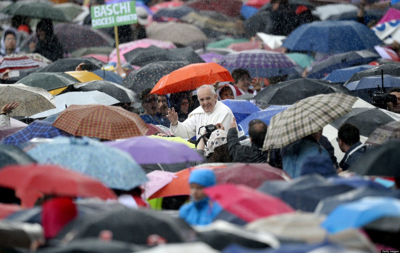 Francis emerged to thunderous cheers, taking off his white cap as he descended the stairs on a windy and rainy day.