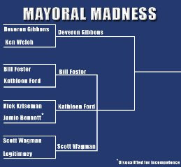 So Gibbons ends up with about 25% of the vote and Bennett still takes about 10%. Larry Williams pulls in another 10, while the rest of the also rans pull in a few hundred votes each. That leaves three candidates, Bill Foster, Kathleen Ford and Scott Wagman, to scramble for the remainder — about 50% — of the votes.