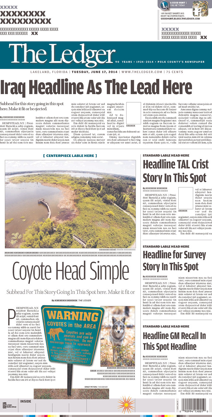 It appears as if the editors at Lakeland’s Ledger newspaper forgot to take out the Greeked-in text and replace it with, you know, copy and headlines. But what you see below is what’s currently up at the Newseum’s collection of front pages from newspapers across the country.