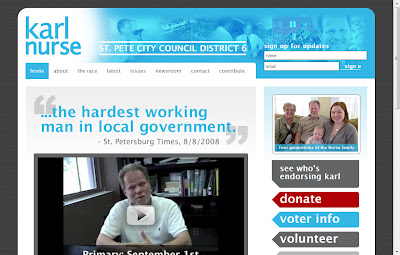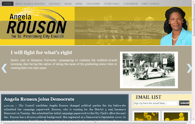 The other site I like is the one designed for Angela Rouson’s campaign. It’s apolitical design and abundance of information designed to assist voters in registering to vote and voting by mail makes this site very user friendly. There isn’t as much information about Angela’s stance on the issues as there is on Karl’s, but there is something friendlier about her site (disclosure: I originally designed her campaign logo), especially in the icon-based navigation system, as opposed to Nurse’s text based. The “slider” picture display is as cool a feature as you will find on a website, political or commercial.