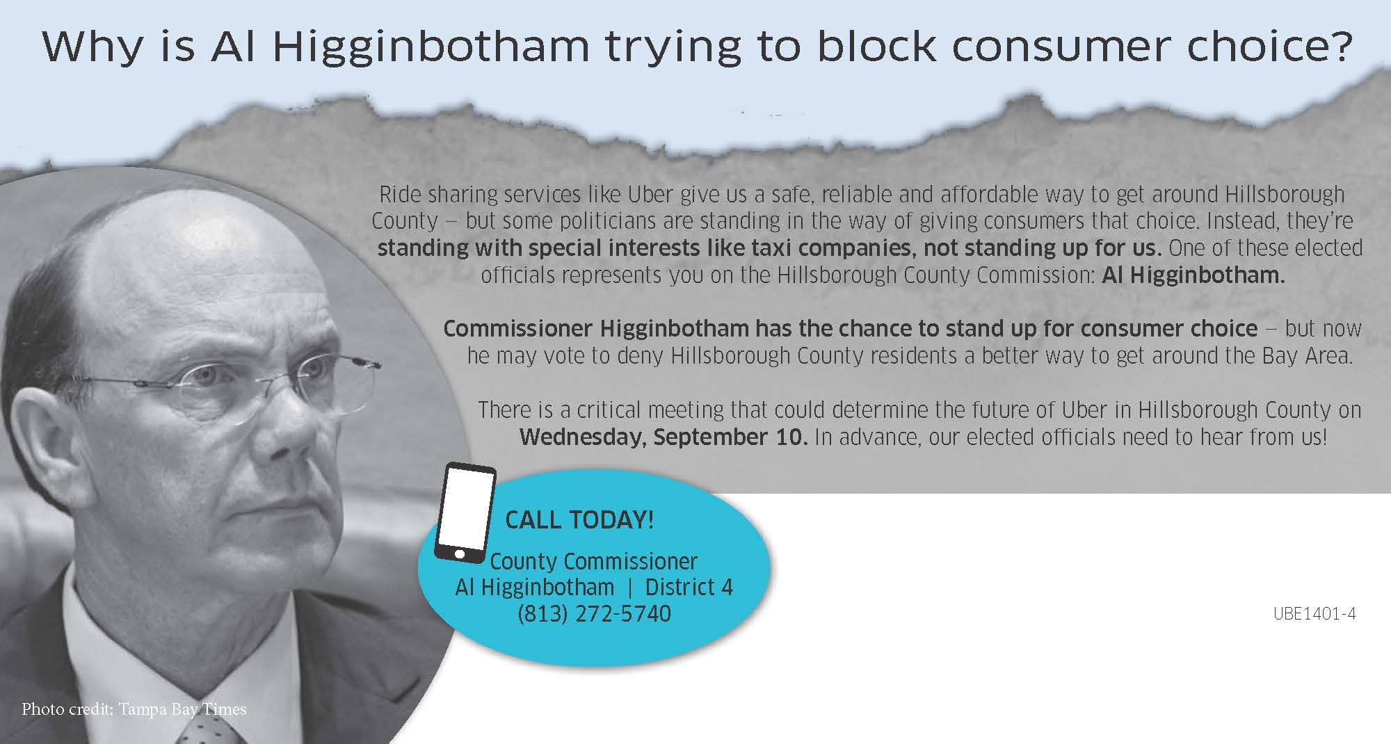 With a campaign of direct mailers hitting Tampa mailboxes over the weekend, Uber calls out the Hillsborough County Public Transportation Commission — the group behind the anti-ridesharing billboards — for “ignoring the pleas of citizens” who want opportunities to get around town cheaply and efficiently.