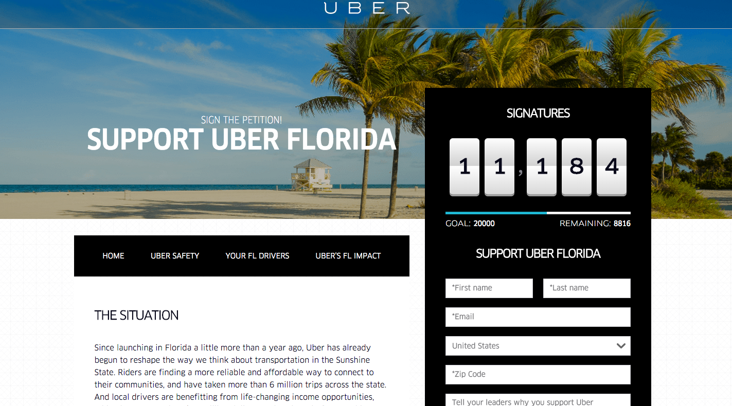 “We need your help to make sure the Legislature doesn’t go home again without taking up ridesharing legislation during the special session,” the email to users and supporters reads. “This is your opportunity to tell Governor [Rick] Scott, House Speaker [Steve] Crisafulli and Senate President [Andy] Gardiner that you want the Uber you know and love to have a permanent home across Florida.”