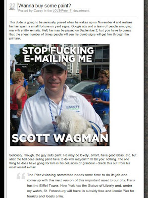 “This dude is going to be seriously pissed when he wakes up on November 4 and realizes he has spent a small fortune on yard signs, Google ads and a team of people annoying me with shitty e-mails. Hell, he may be pissed on September 2, but you have to guess that the sheer number of times people will see his dumb signs will get him through the primary.”